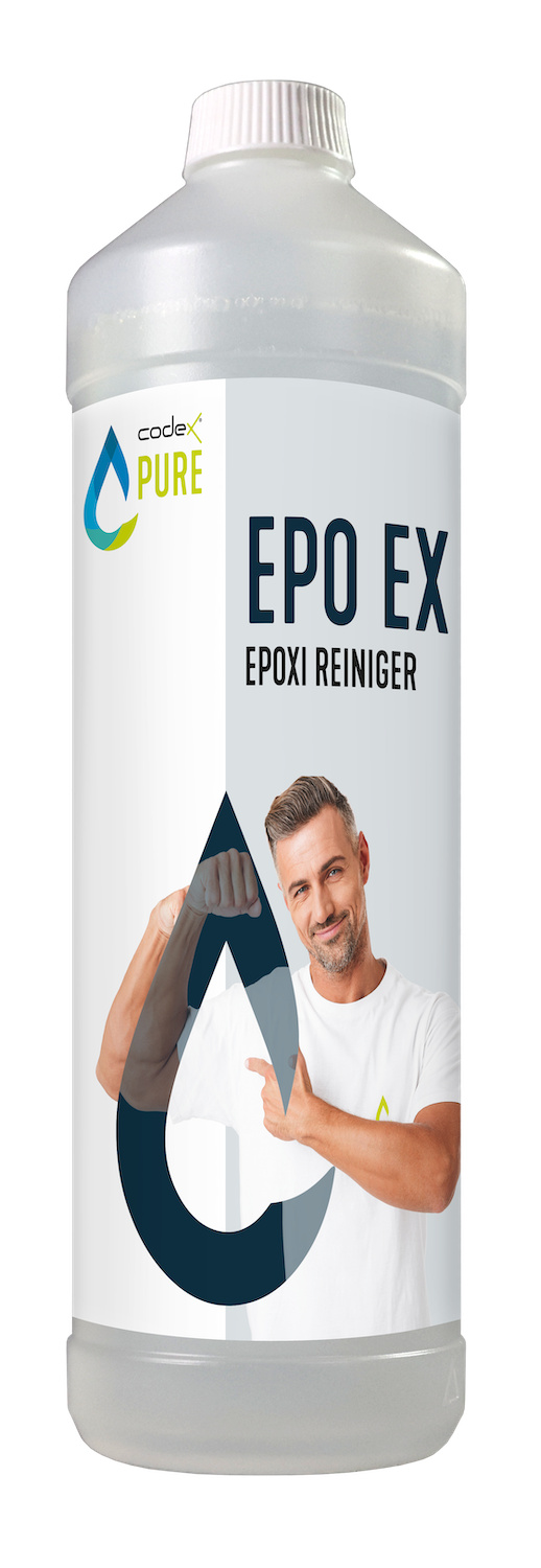 Der Epoxi-Reiniger codex Pure Epo Ex entfernt angetrocknete Epoxidharzschleier nach der Epoxiverfugung.